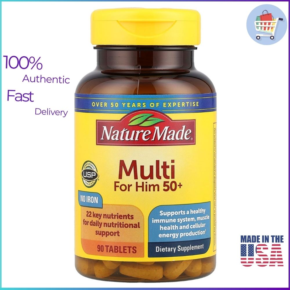 Nature Made Multi For Him 50+, 90 Tablets is specially developed for men aged 50 and above to help fill nutrient gaps in daily diets. Each tablet delivers a blend of 22 essential vitamins and minerals that support immune function, healthy muscle and bone strength, and cellular energy production — all in a convenient once-a-day formula. This premium multivitamin does not contain iron (often not required in men 50+) and is free from gluten, artificial colors, and artificial flavors.