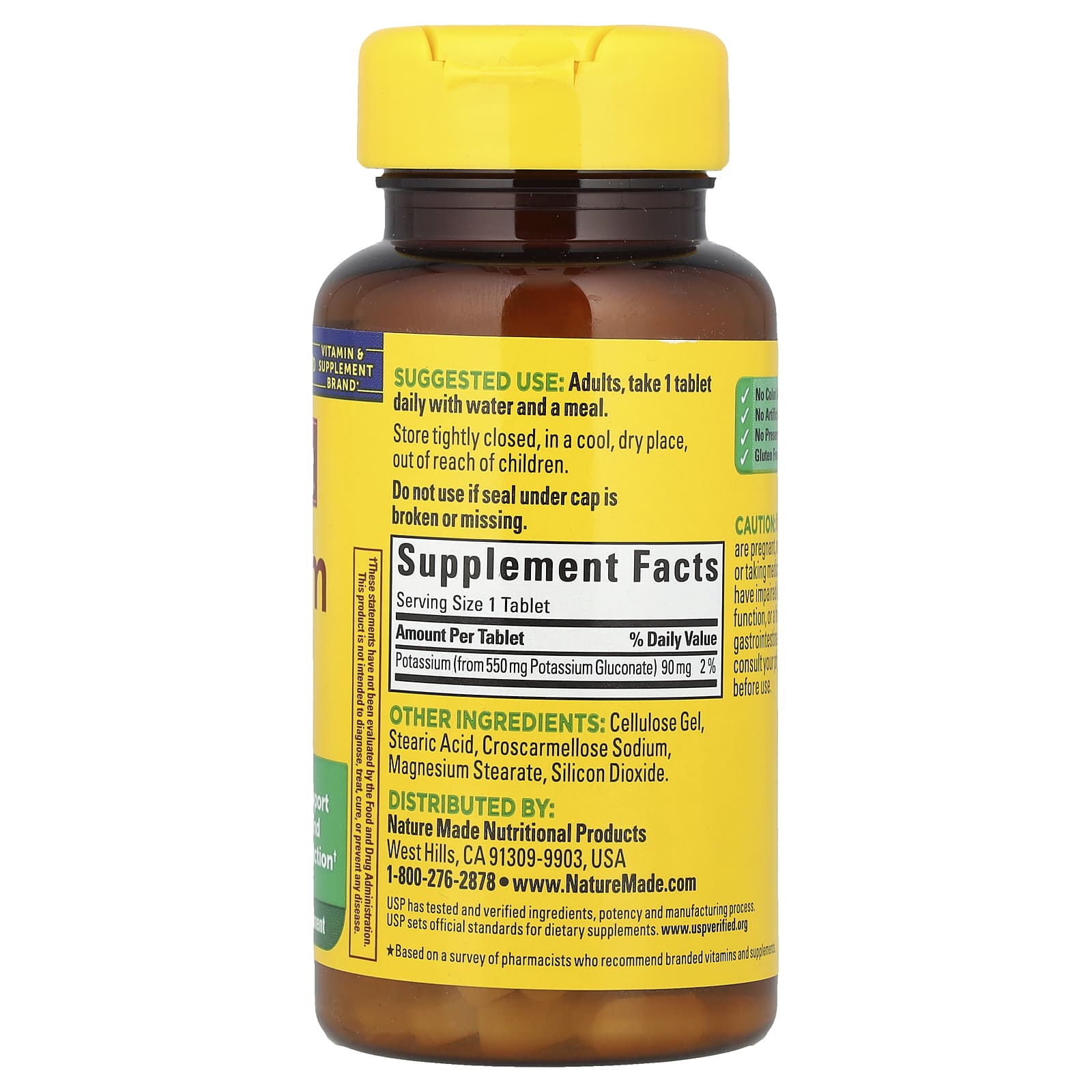 Nature Made Potassium Gluconate 90 mg is a high-quality dietary mineral supplement designed to support everyday wellness. Potassium is an essential electrolyte that your body needs for key functions such as maintaining a healthy heart rhythm, muscle contractions, nerve signaling, and fluid balance.