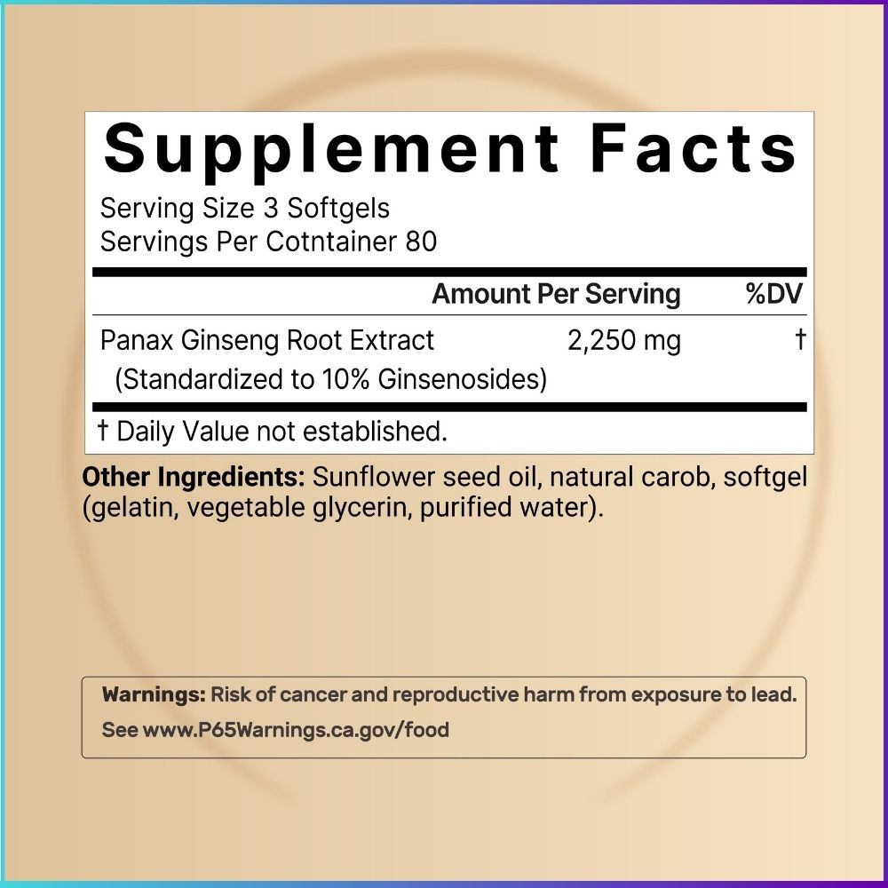 - Korean Red Panax Ginseng Extract (6-Year-Old Root): 2,250 mg (Standardized to contain 10% Ginsenosides)