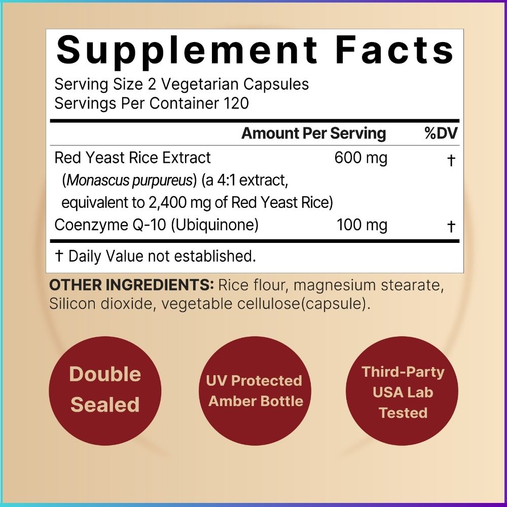 Red Yeast Rice has been traditionally used for maintaining lipid balance, while CoQ10 (Ubiquinone) is a vital nutrient needed for heart energy metabolism. Together, they create a balanced and effective daily supplement for overall cardiovascular wellness.