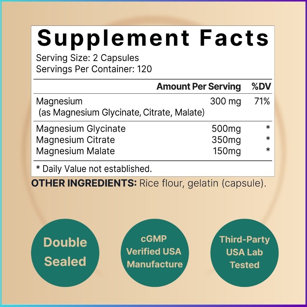 With 500 mg Glycinate, 350 mg Citrate, and 150 mg Malate, this supplement offers one of the most balanced and effective magnesium complexes on the market. Double-sealed for purity, manufactured under cGMP standards in the USA, and third-party lab tested for safety, this formula ensures consistent quality you can trust every day.
