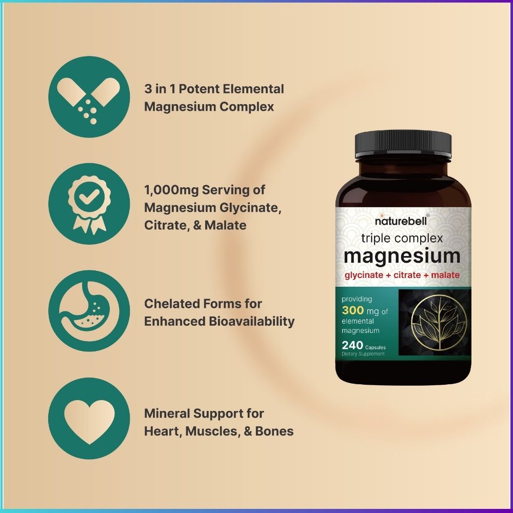 NatureBell Triple Complex Magnesium is a premium, science-backed formula that combines three highly bioavailable forms of magnesium — Glycinate, Citrate, and Malate — delivering a total of 300 mg elemental magnesium per serving. This triple-blend is designed to support relaxation, muscle recovery, deeper sleep, bone strength, heart function, and overall nervous system stability.