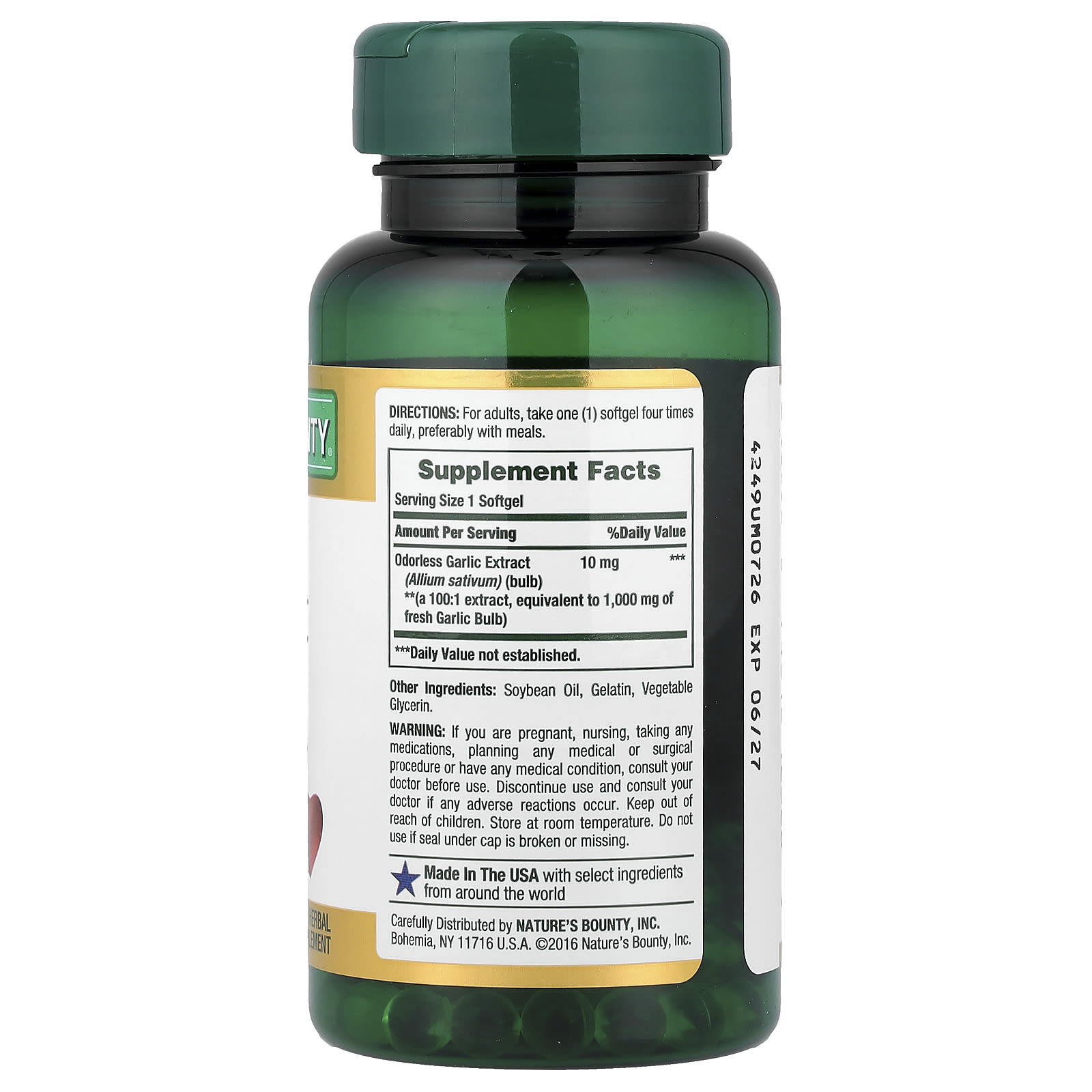 Nature’s Bounty Garlic Extract delivers the natural power of garlic in a highly potent, odorless softgel form. Traditionally used for centuries, garlic extract is renowned for supporting heart and cardiovascular health, healthy circulation and overall wellness. Each softgel provides the equivalent of 1,000 mg of fresh garlic bulb, helping you get more out of life every day.*
