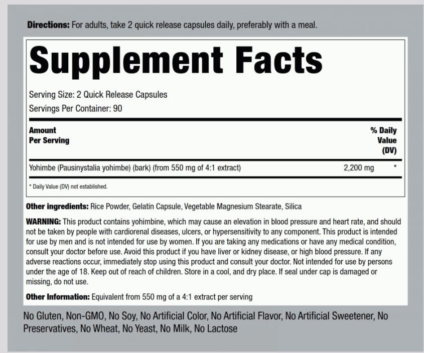 | Yohimbe (Pausinystalia yohimbe) Bark Extract (from 550 mg of 4:1 extract) | 2200 mg | * |