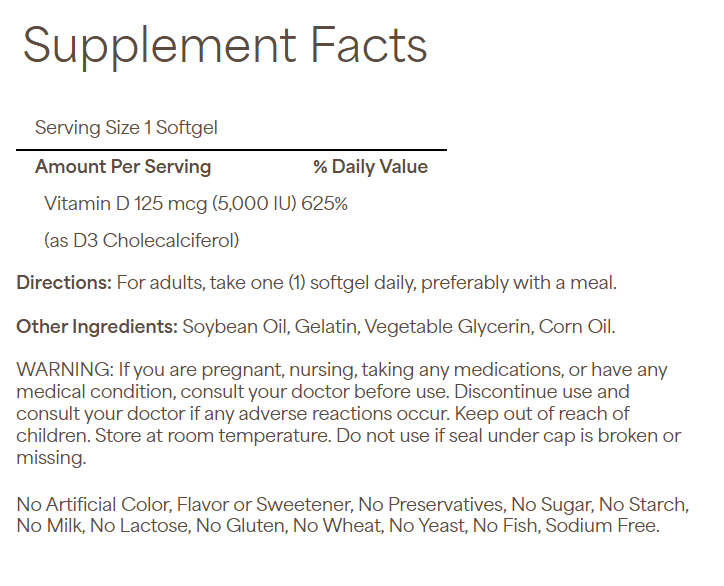Description: Sunlight is the natural way to produce Vitamin D, essential for Calcium absorption, maintaining blood calcium and phosphorus levels, and supporting bone health and neuromuscular function. However, busy lifestyles, indoor routines, and sun protection practices can limit sun exposure. Puritan’s Pride Vitamin D3 offers a reliable alternative to keep your Vitamin D levels on track.